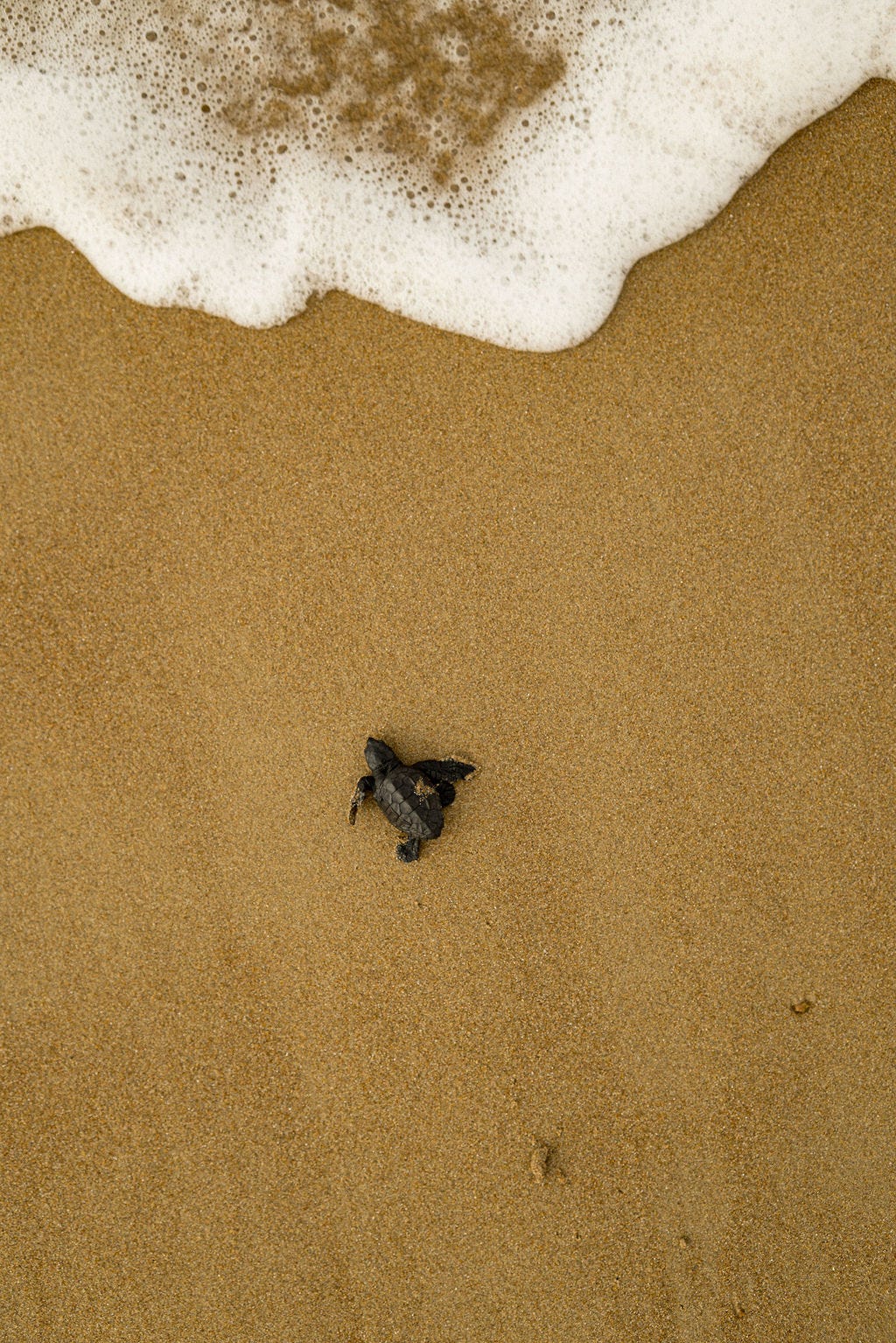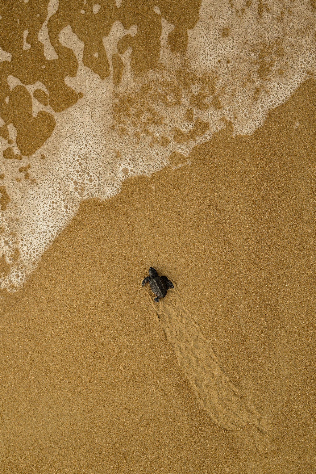 “Het was zo’n puur natuurmoment. Zo’n klein schildpadje dat net uit het ei komt en instinctief richting zee loopt. Dat is echt magisch. En met de 35mm kon ik er mooi boven hangen, waardoor je die kleine pootjes en voetstapjes in het zand ziet. Dat werkte perfect.”